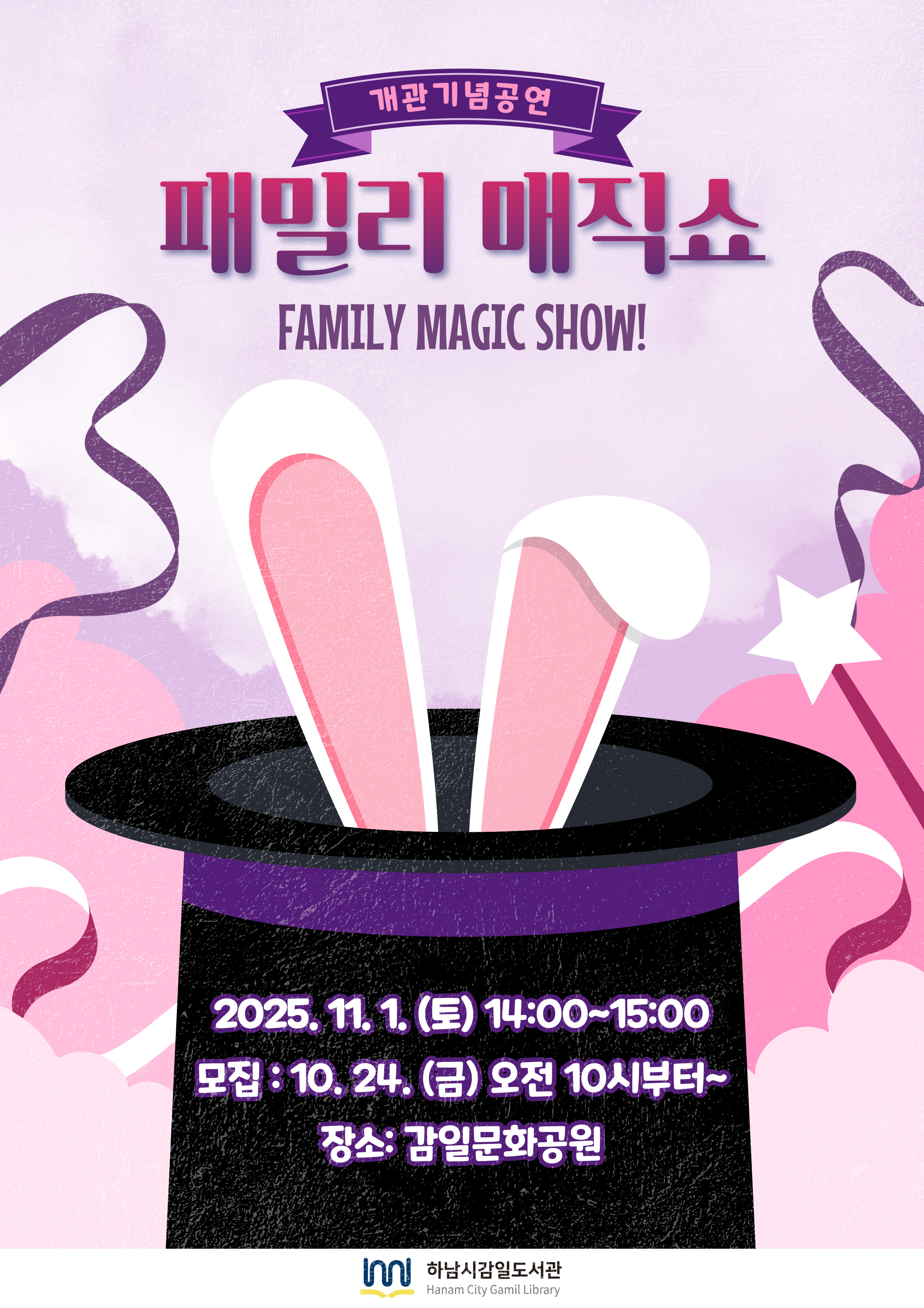 | 내용 | ★ 2인까지 접수 가능합니다. - 2인 접수 시, 비고란에 이름을 적어주세요. ★ 당일 접수자를 대상으로 돗자리를 대합니다. ★ 신청을 못하셨더라도, 자유롭게 관람이 가능합니다. - 신청기간 : 10월 24일 오전 10시부터 ~ (선착순 마감시까지) - 신청방법 : 감일도서관 홈페이지를 통해 접수 (로그인 필수!) ※ 주차는 40분 무료이며, 이후 발생되는 주차요금은 자부담입니다. ※ 일정 및 내용은 도서관 사정에 따라 변경될 수 있습니다. ※ 프로그램 참여 시, 도서관 홍보를 위한 사진 촬영 및 활용에 동의하는 것으로 간주합니다.
