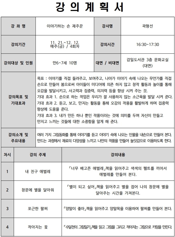| 내용 | ★수강신청 시, 신청자와 수강자가 다를 경우 비고란에 인적사항을 적어주세요. - 이름, 나이, 성별 (ex. 최하남, 만7세, 여성) ※ 1계정 당, 1명만 신청 가능합니다. - 두 명의 자녀를 신청 할 경우 두 개의 아이디가 필요합니다. ※ 일정 및 내용은 도서관 사정에 따라 변경될 수 있습니다. ※ 프로그램 참여 시, 도서관 홍보를 위한 사진 촬영 및 활용에 동의하는 것으로 간주합니다. ▷ 대상 : 유아 만6~7세 10명 ▷ 일시 : 11.21.~12.12. 매주(금) 16:30~17:30 ▷ 장소 : 3층 문화교실 ▷ 신청 : 10. 24.(금) 10시부터 ~ 선착순 마감 ▷ 문의 : 031-5182-1158 ▷ 강의계획서 : 붙임파일 참고